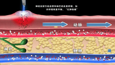 热冲击结合了二氧化碳的压力,其作用类似于人工淋巴引流,结合人体淋巴系统的分布规律,可加强淋巴回流,促进渗出物的吸收。